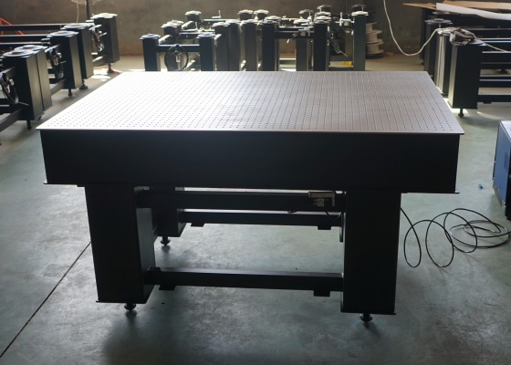 ■台板采用钢制芯夹板结构,具有重量轻、高刚度、高阻尼等优点,上面板为icr17优质高导磁不锈钢,经精密研磨处理,平面度高,回旋打磨工艺清除毛边,达到无反射、亚光效果,面板具有M6螺孔阵列,易于固定光学元件。